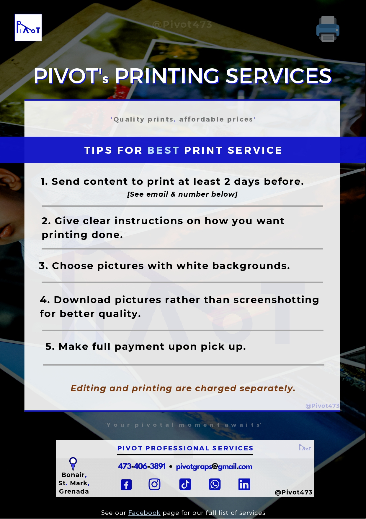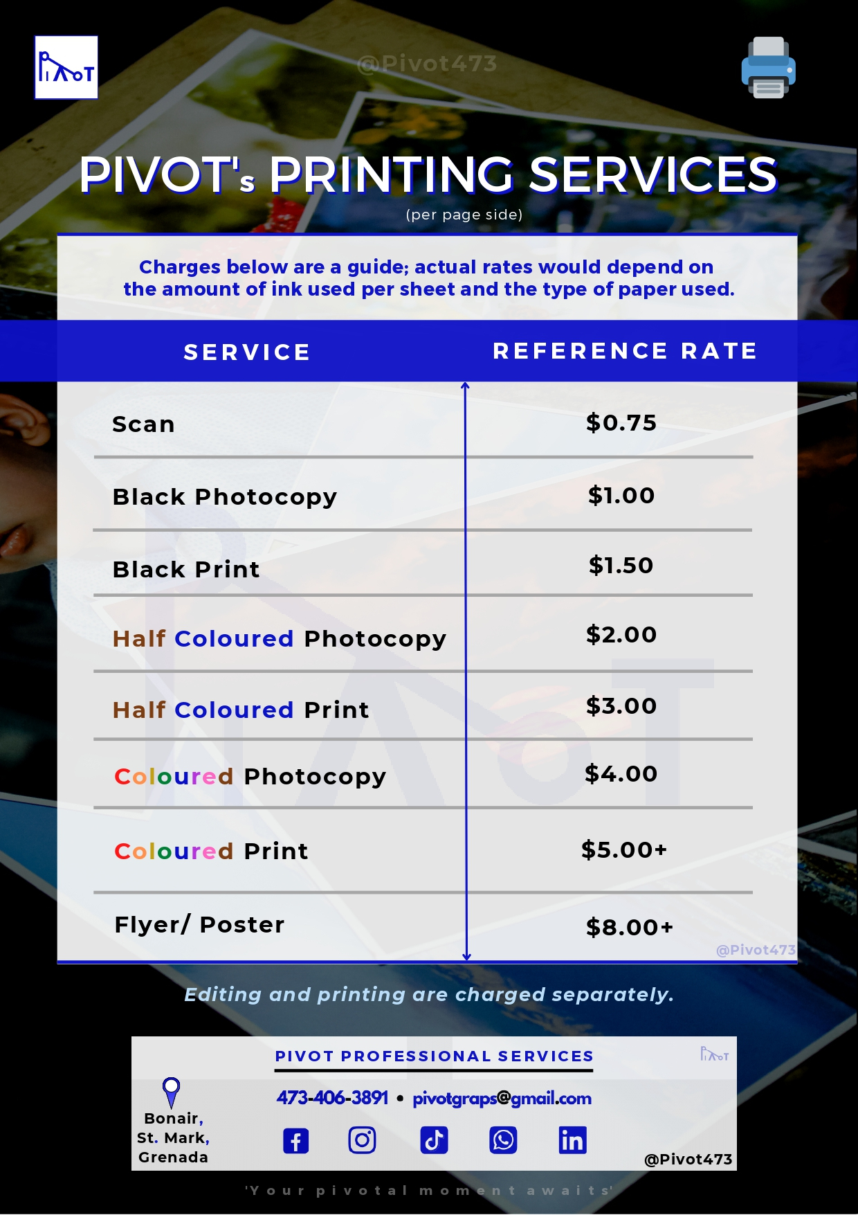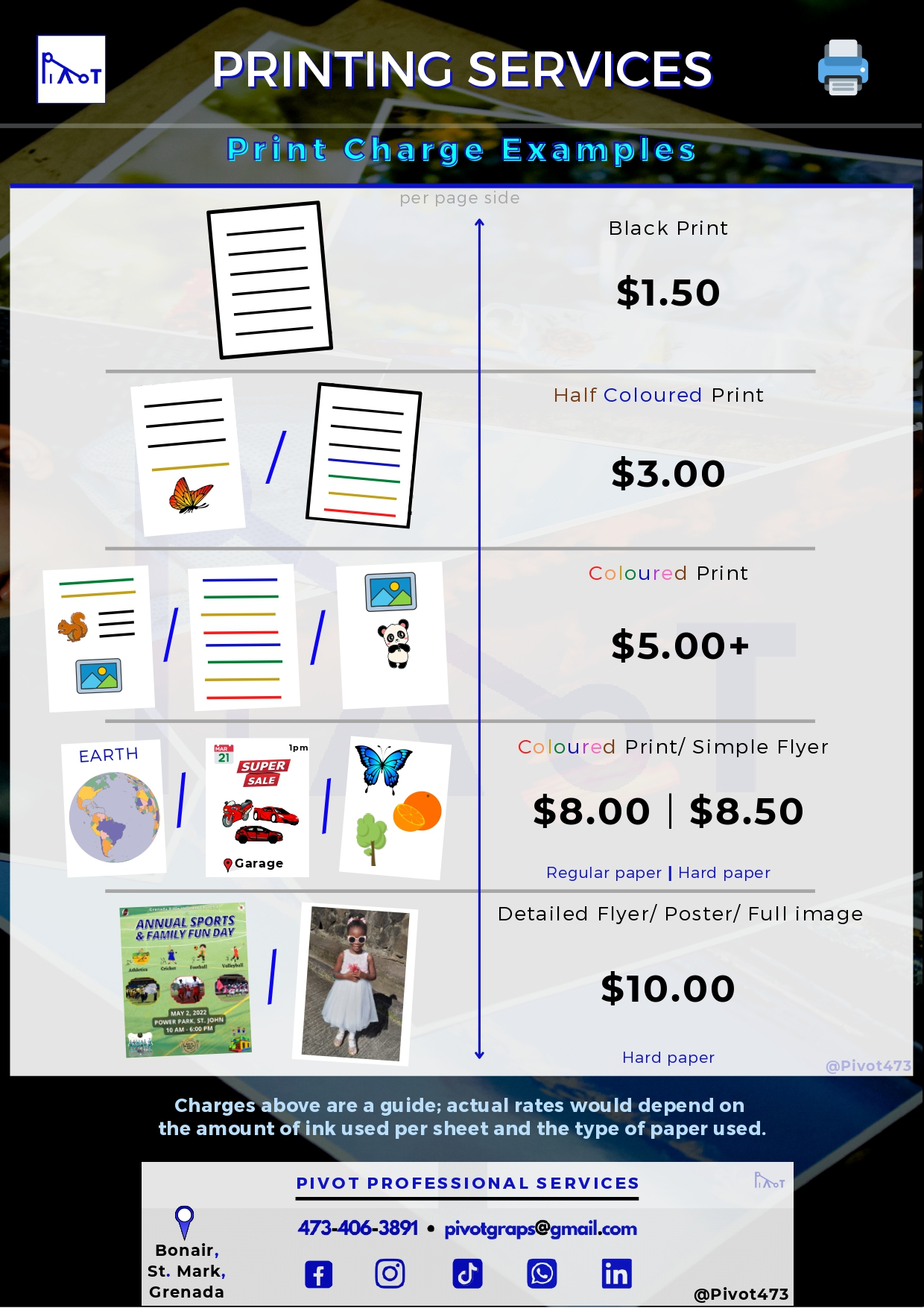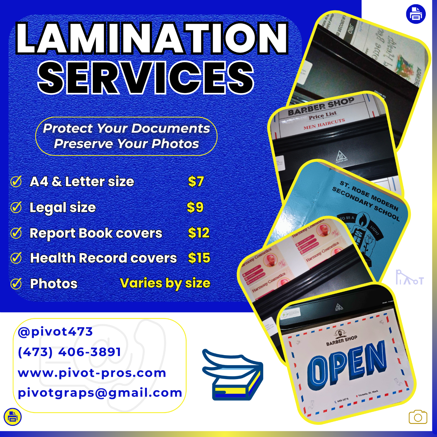 Request a quote or book this service by filling out the form. Attach the document(s) you need printed, copied, scanned or laminated. If it exceeds the file size attachment limit then email your document(s) to pivotgraps@gmail.com